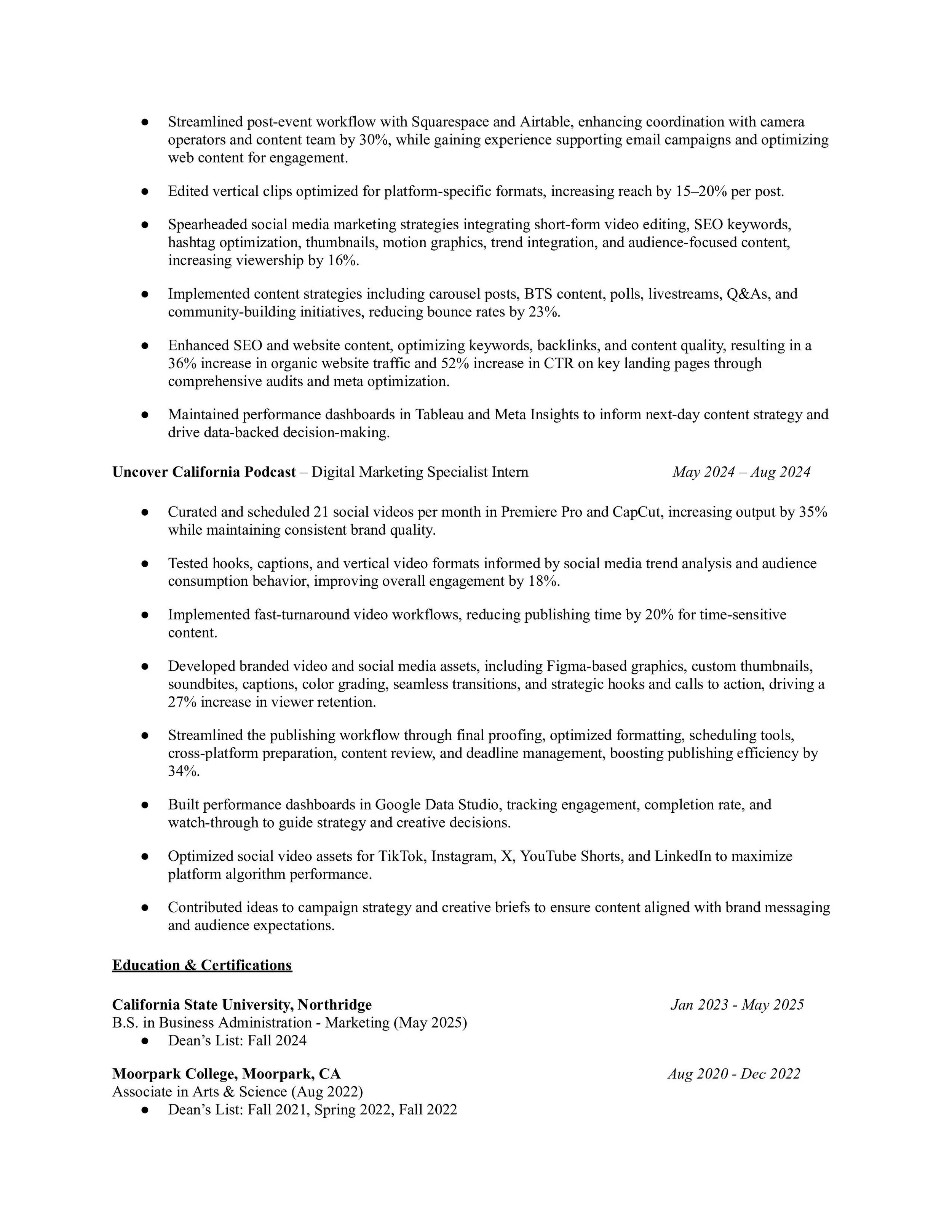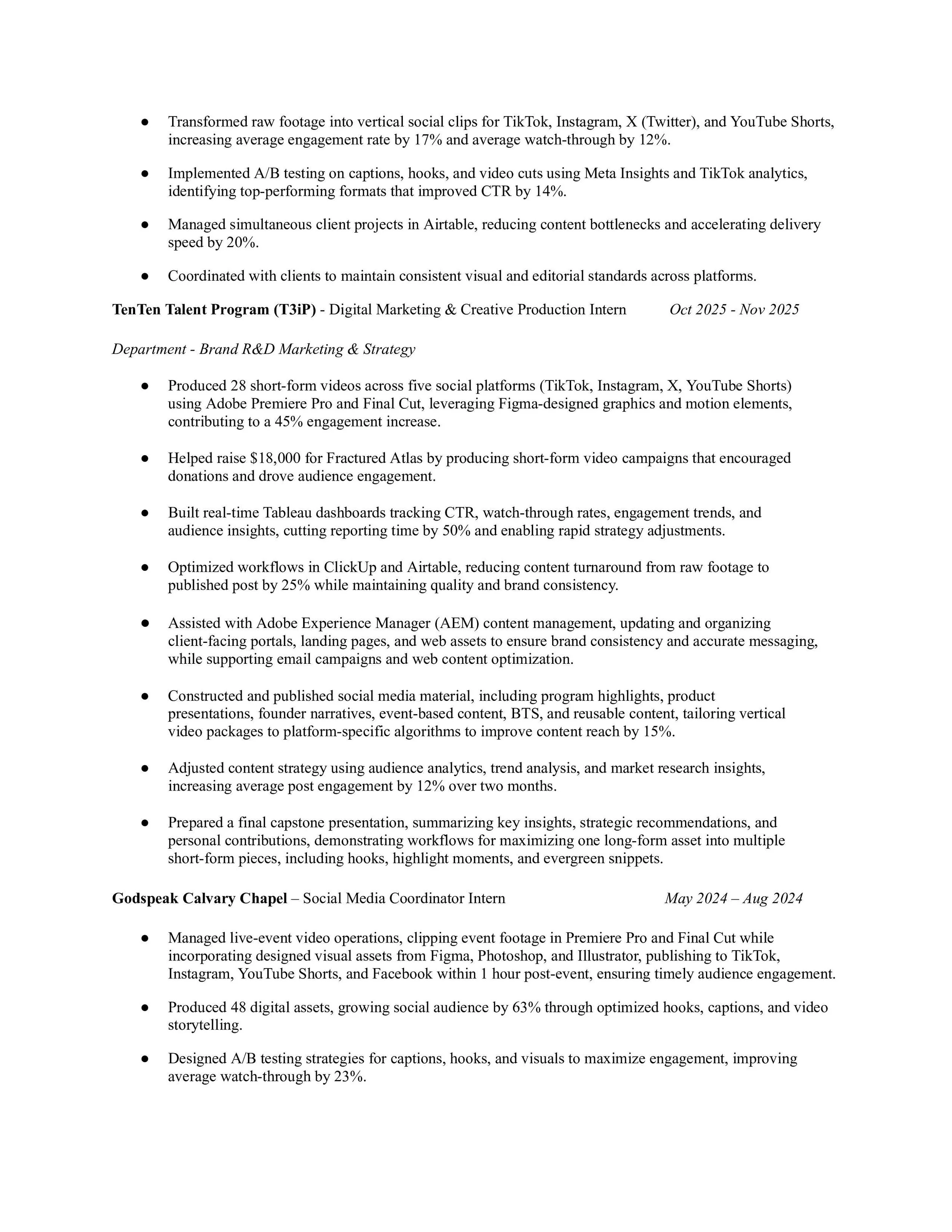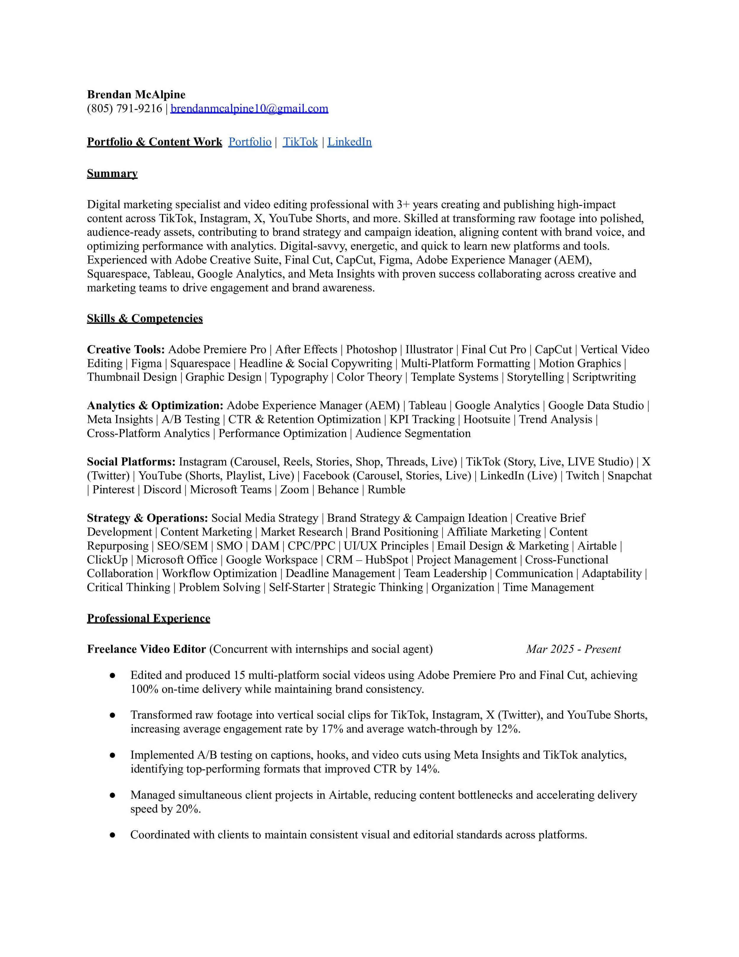 Hi, I’m Brendan! I’m a video editor who loves turning ideas, stories, and concepts into captivating visuals. Whether through social clips, promo videos, or creative projects, I ensure every edit is polished, engaging, and tailored to your vision. I’m passionate about storytelling, and I strive to make every project not just seen—but remembered.